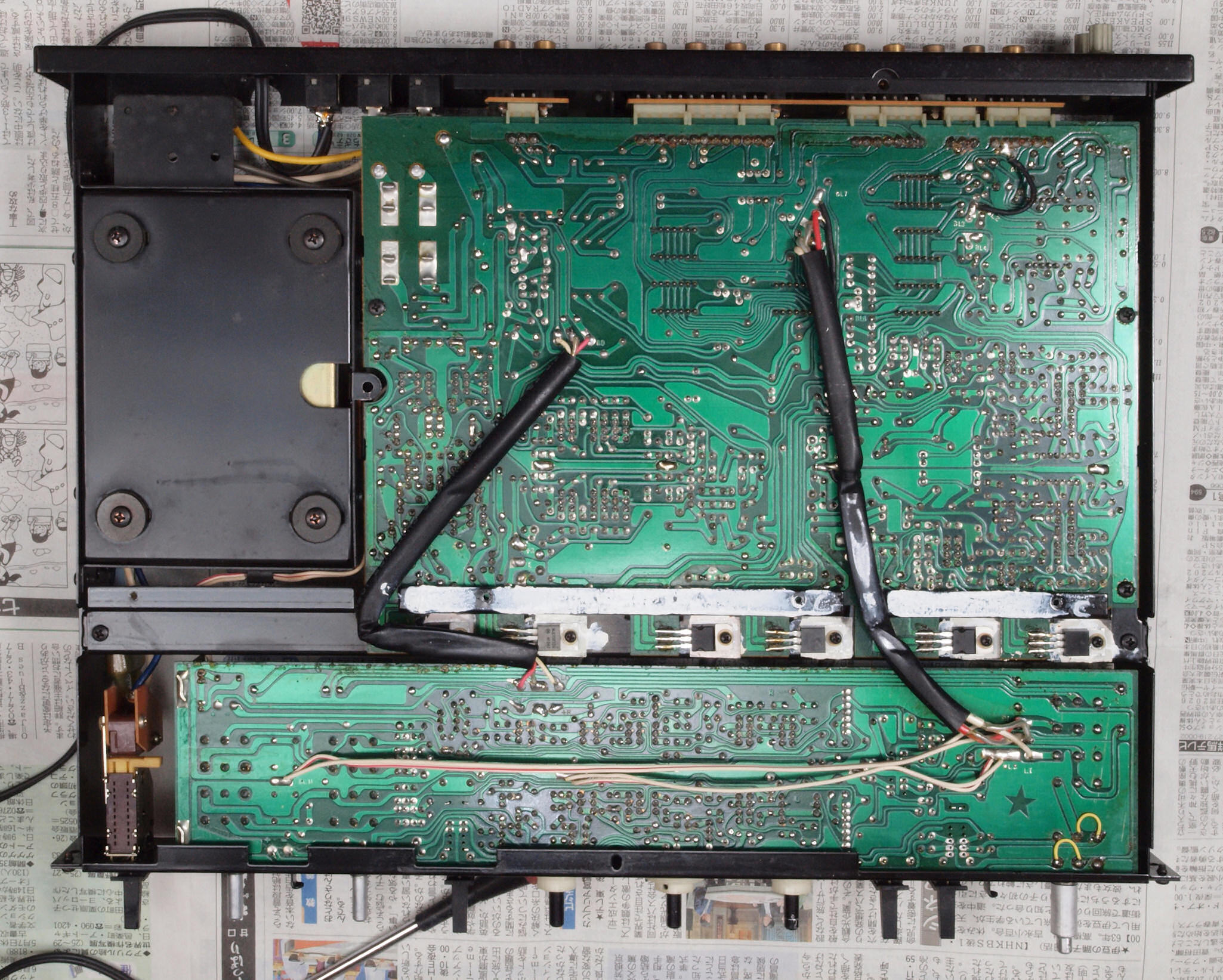 | A18. 点検中 サイドパネル、シールド、上カバーを取り、上から見る。 ミュートSW半田未処理。 バランスVR短絡処理。 | ||||||||||||||||||||||||||||||||||||||||||||||