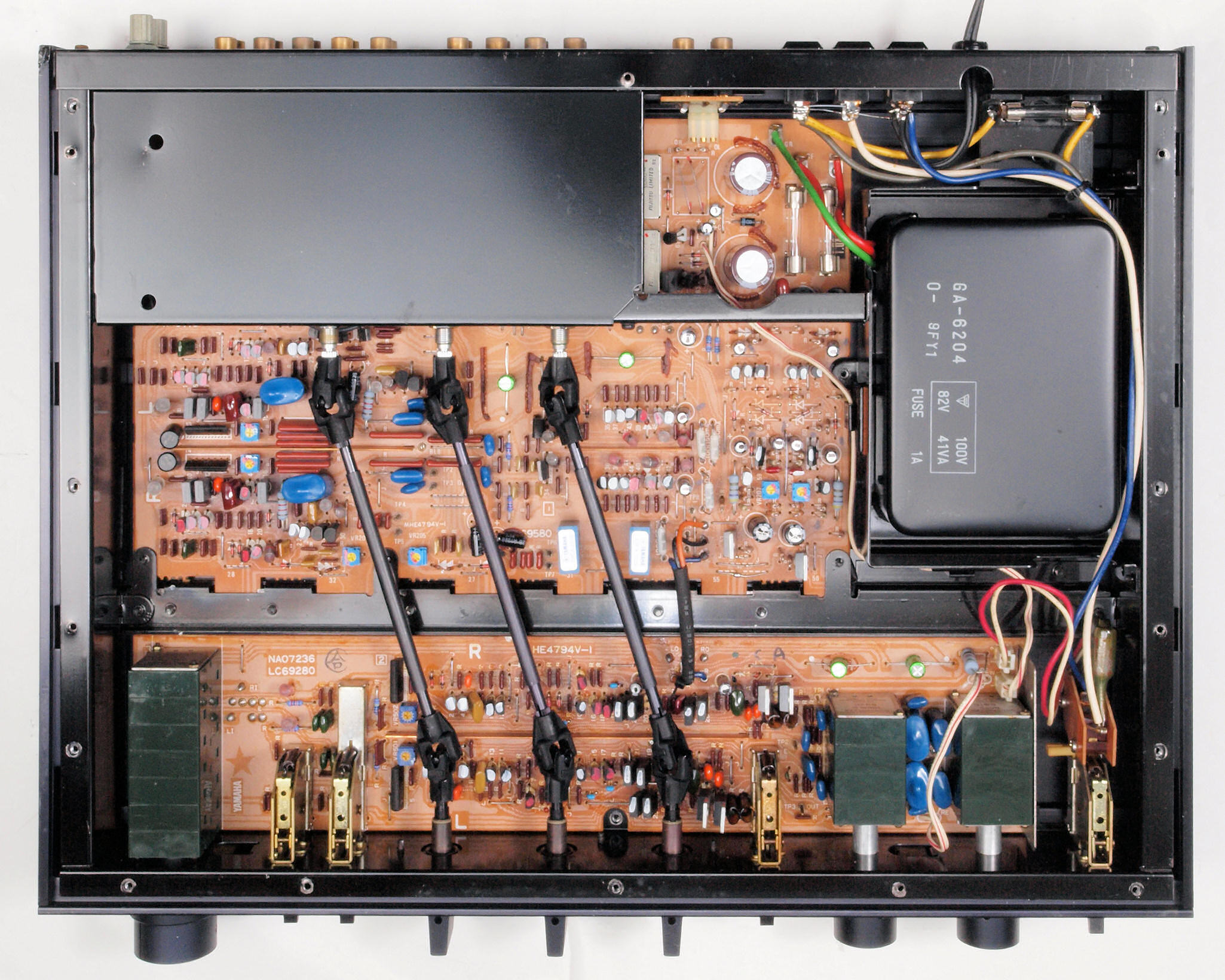 | A2A. 点検中 上下カバー、シールドを取り、下から見る。 トーンアンプ・ヤマハオリジナルの出力のフイルムコンデンサーが電解コンデンサーに交換されている。 | ||||||||||||||||||||||||||||||||||||||||||||||