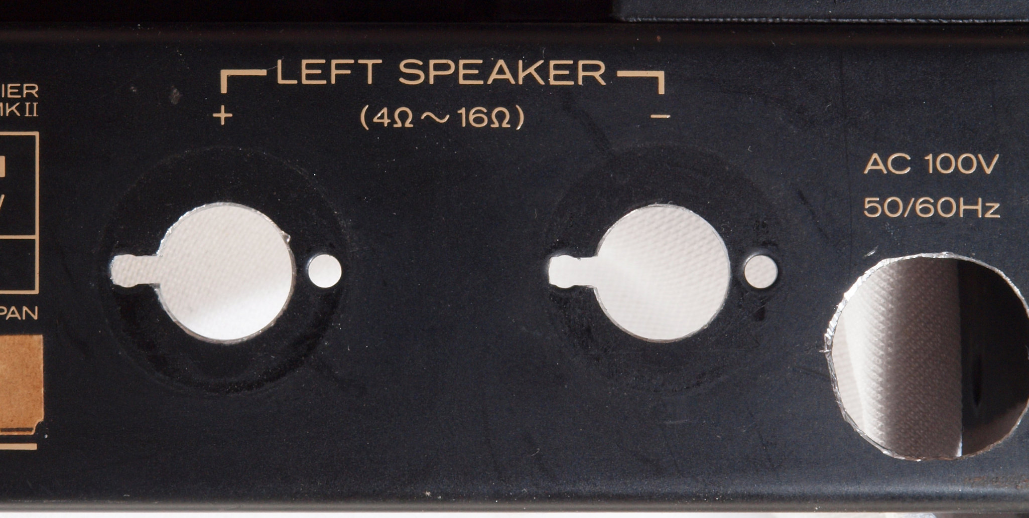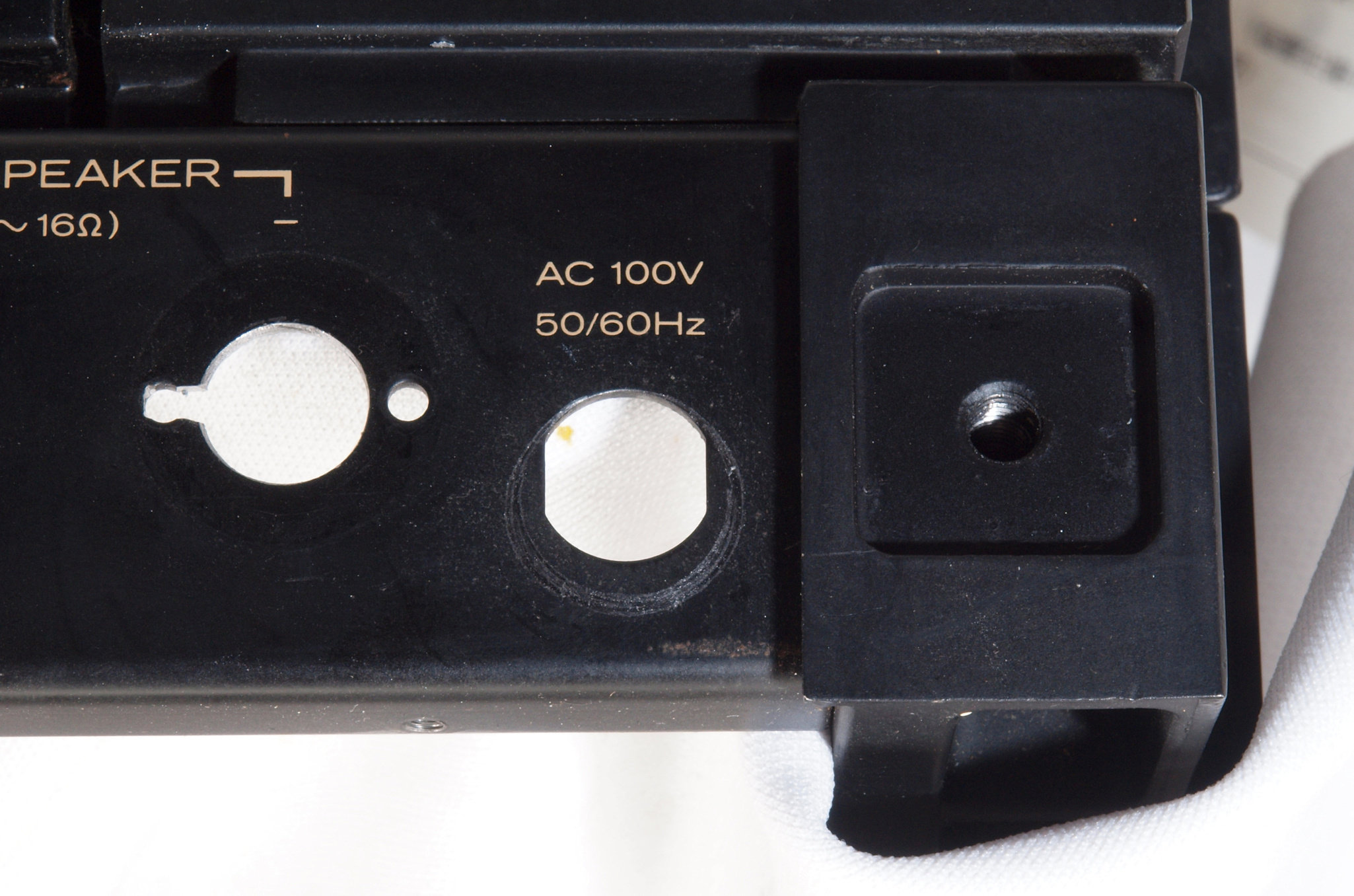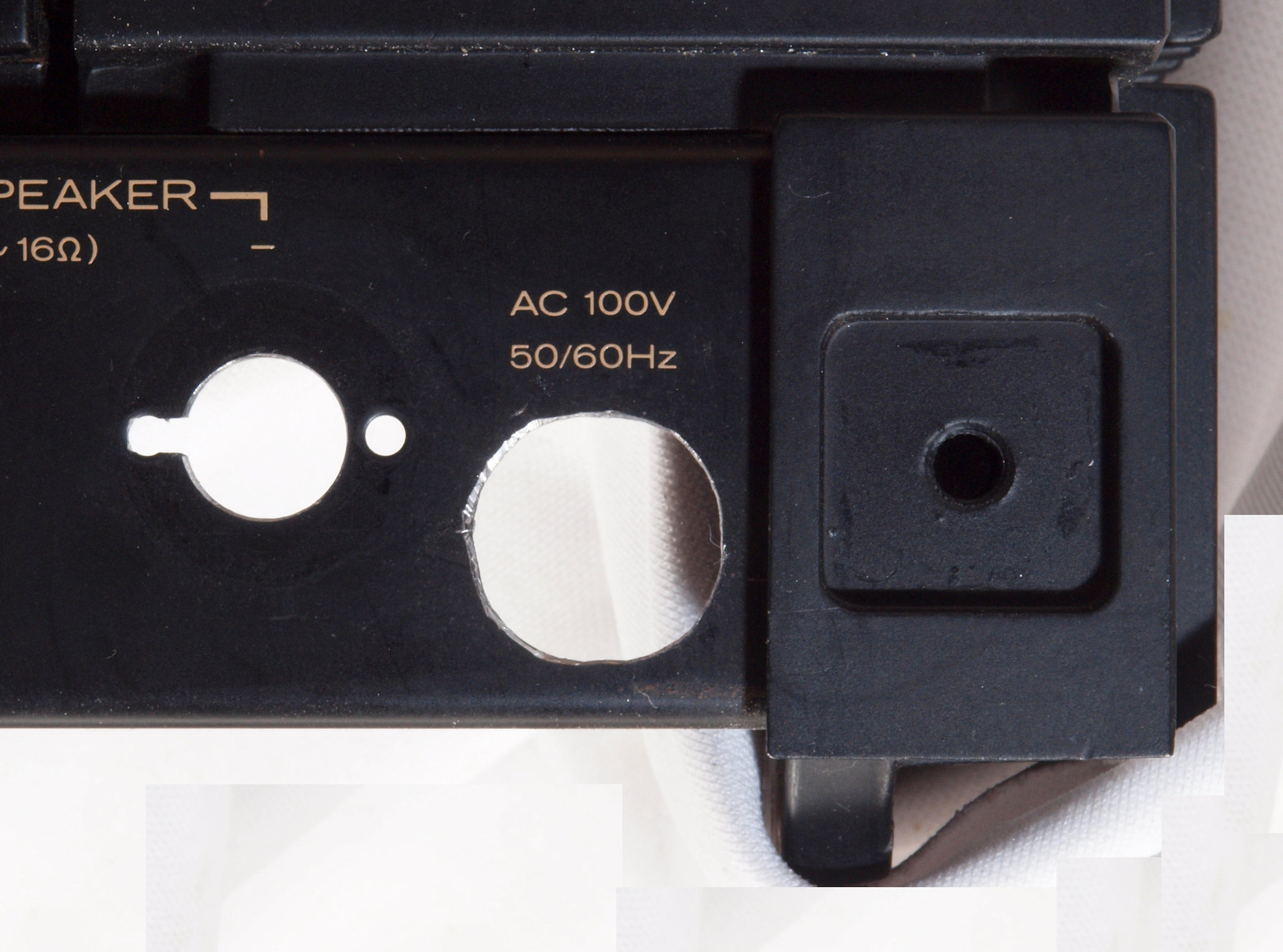 | CB2. 修理中 電源ケーブル取り付け部穴加工前。 SP接続端子との距離を取る為に、下右方向へ広げる為、昔ながらのヤスリで削る。 |